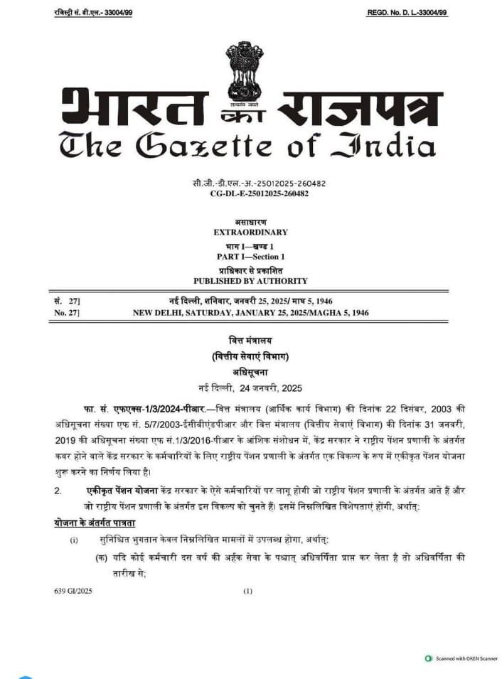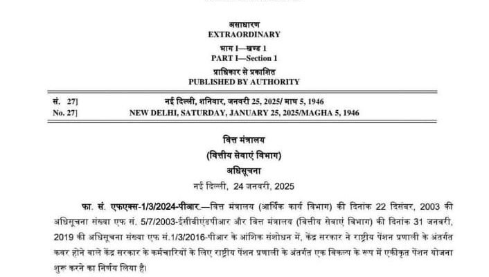केंद्र सरकार ने कर्मचारियों के लिए यूनिफाइड पेंशन स्कीम (UPS) का ऐलान कर दिया है। ये योजना 1 अप्रैल 2025 से लागू होगी